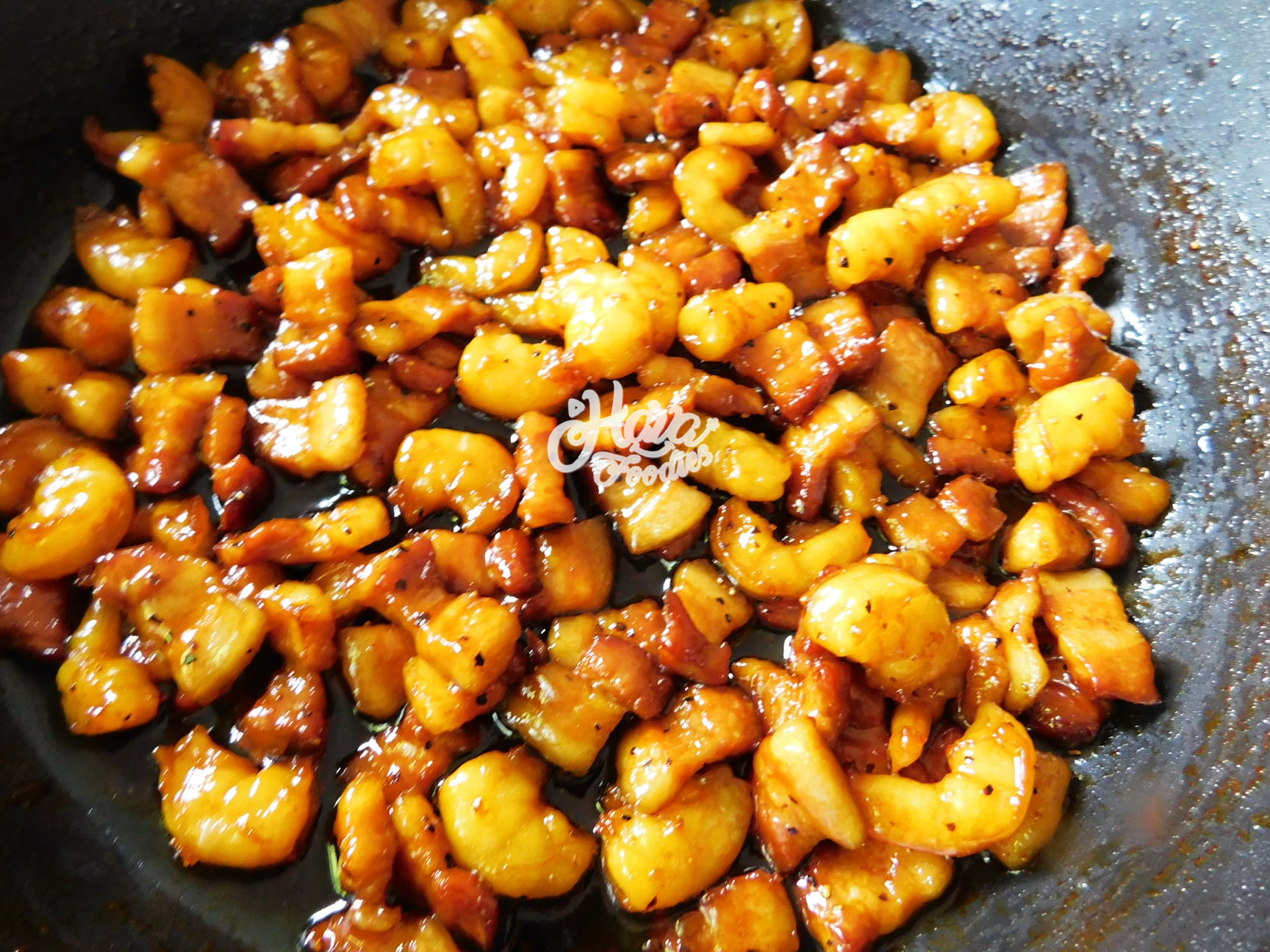 Bắc chảo lên bếp, cho vào 2 muỗng canh dầu ăn, đợi dầu nóng cho thịt vào xào trong 1 phút đến khi thịt săn lại thì tiếp tịuc cho tôm vào, xào trong khoảng 10 phút. Sau khi tôm chuyển sang màu cam thì trút chúng ra tô.
