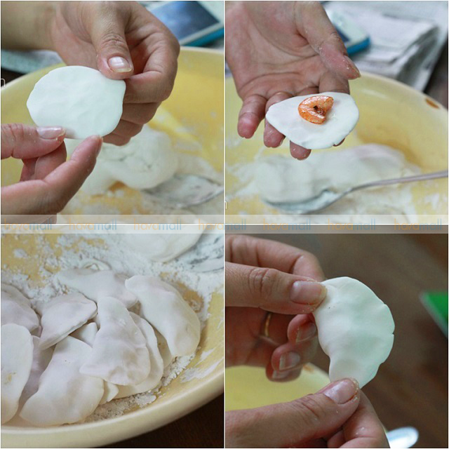 > Sau đó, nhẹ nhàng cho nhân bánh gồm thịt và tôm vào rồi dùng tay ép chặt các mép bánh lại với nhau thật khít để khi luộc bánh không bị bung ra.
