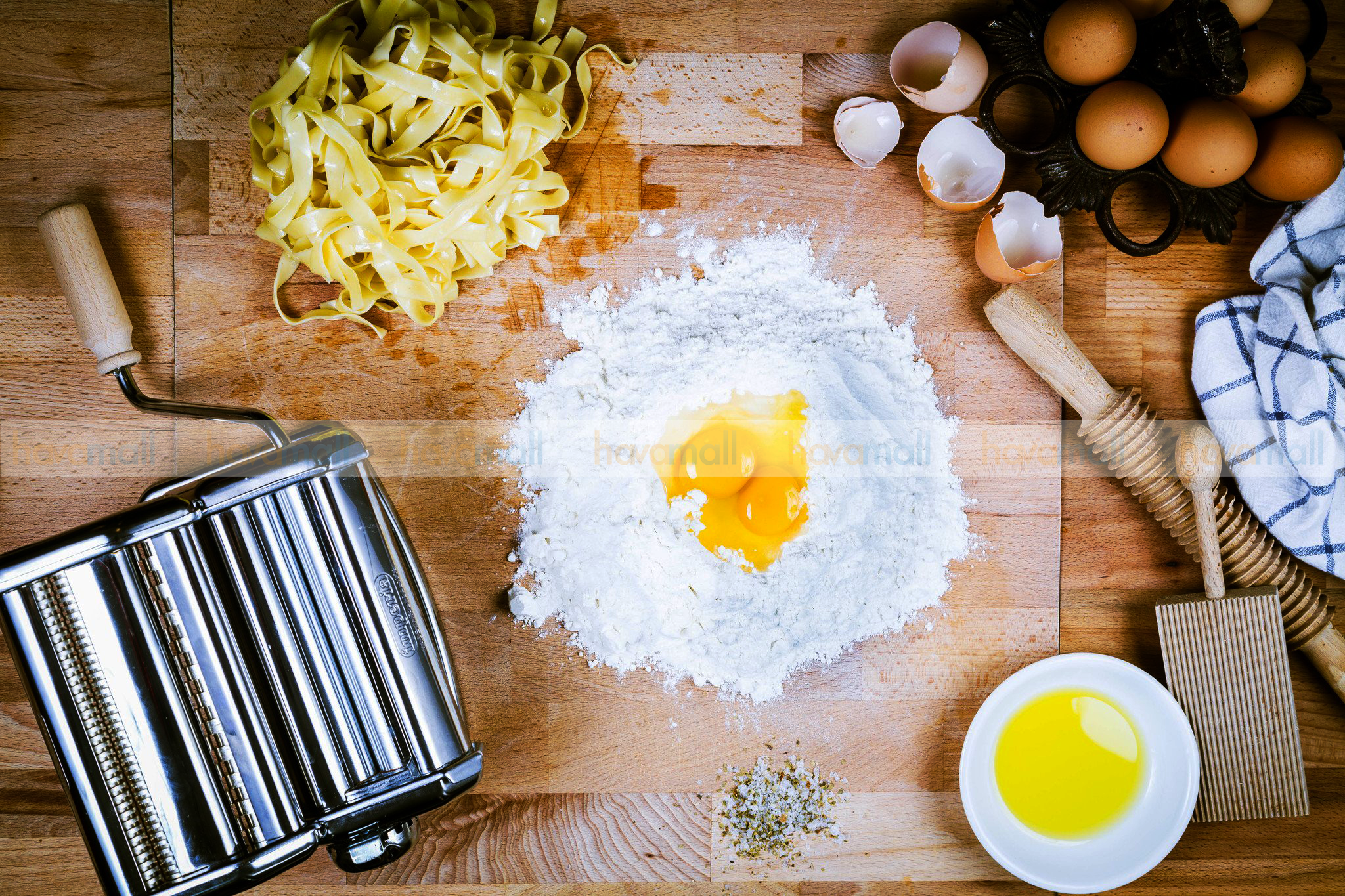 Bước 1:Rây kỹ bột mì đa dụng, bột semola và một chút muối. Trộn hỗn hợp bột mới vừa được ray và tạo một lỗ trống ở giữa. Đập trứng vào lỗ đã được tạo và thêm dầu ô liu. Dùng nĩa đánh trứng thật nhẹ nhàng, bột dần dần chảy xuống lỗ trống và hòa quyện vào trứng cho đến khi tất cả được trộn đều. Khi hỗn hợp bột trở nên đặc lại và chắc tay hơn bận hãy bắt đầu nhào bột bằng tay. Nếu bột bị khô, bạn có thể dùng ngón tay rưới nước lên và tiếp tục nhào để bột hòa quyện vào nhau.