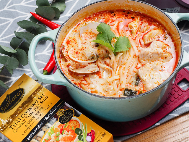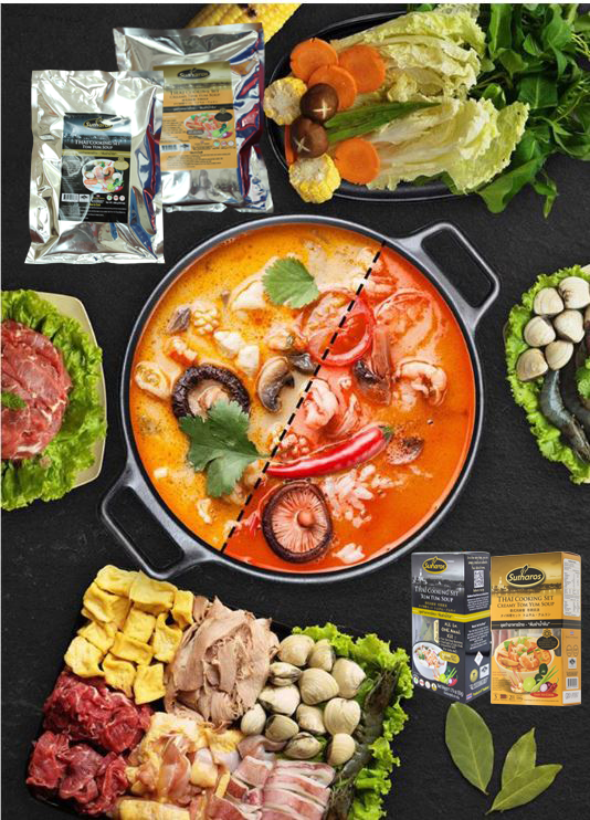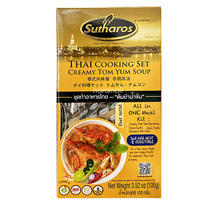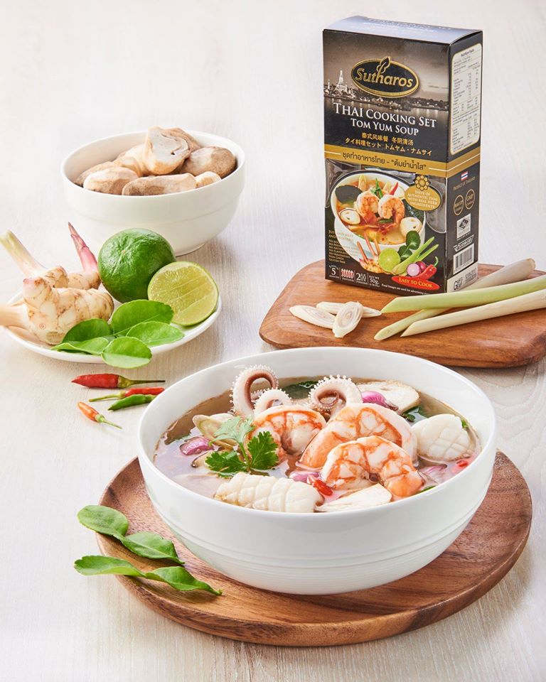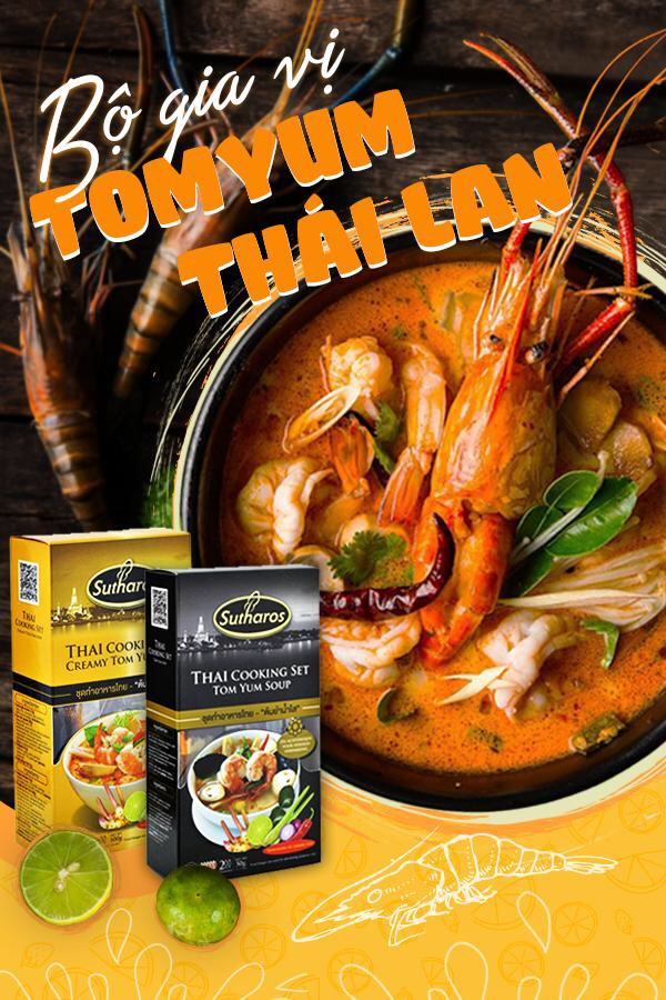 Tom Yum – Món canh chua cay ăn nóng mang tinh hoa của nền ẩm thực xứ sở Chùa Vàng – Nhiều năm liền được tạp chí CNN của Mỹ bình chọn đứng thứ 8 trong top 50 món ăn ngon và phổ biến nhất thể giới  – Gia vị Súp Tom Yum của thương hiệu Sutharos là sự kết hợp hài hòa giữa các loại thảo mộc sấy khô và các gia vị truyền thống của người Thái. Tom Yum như một lời khẳng định mạnh mẽ cho ẩm thực Thái với vị cay nồng và chua đặc trưng. Húp 1 muỗng Tom Yum, vị giác của bạn sẽ thức tỉnh ngay lập tức