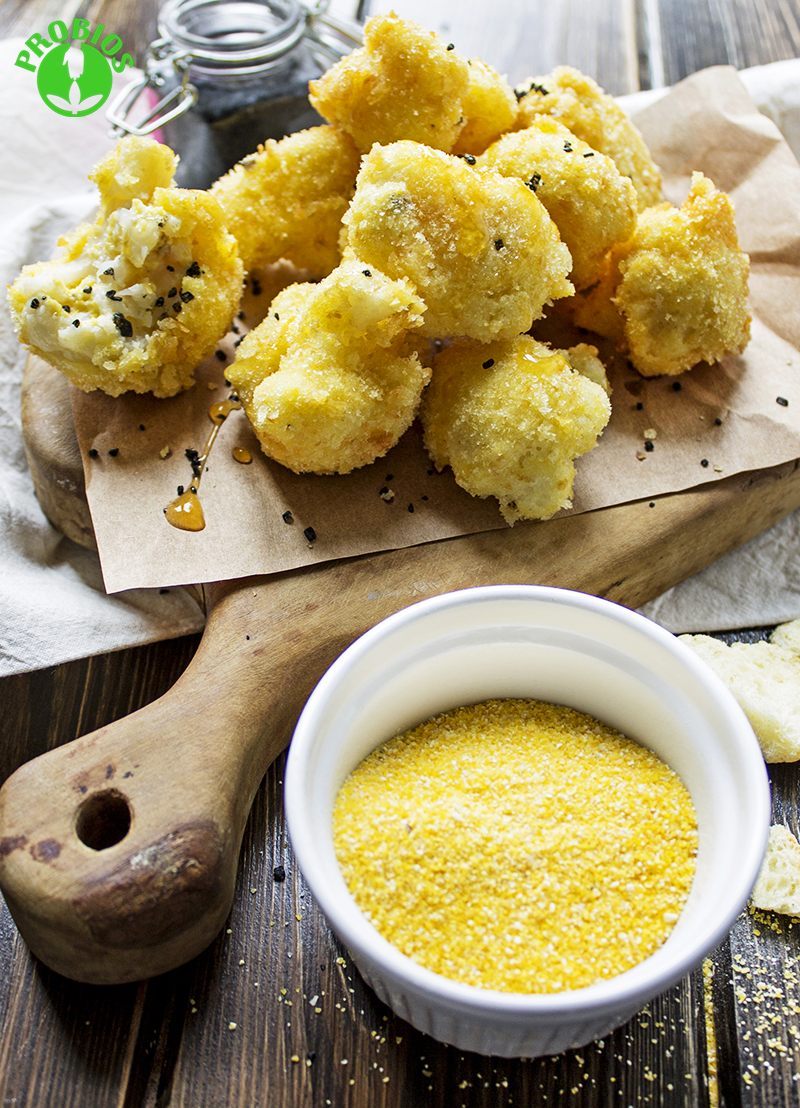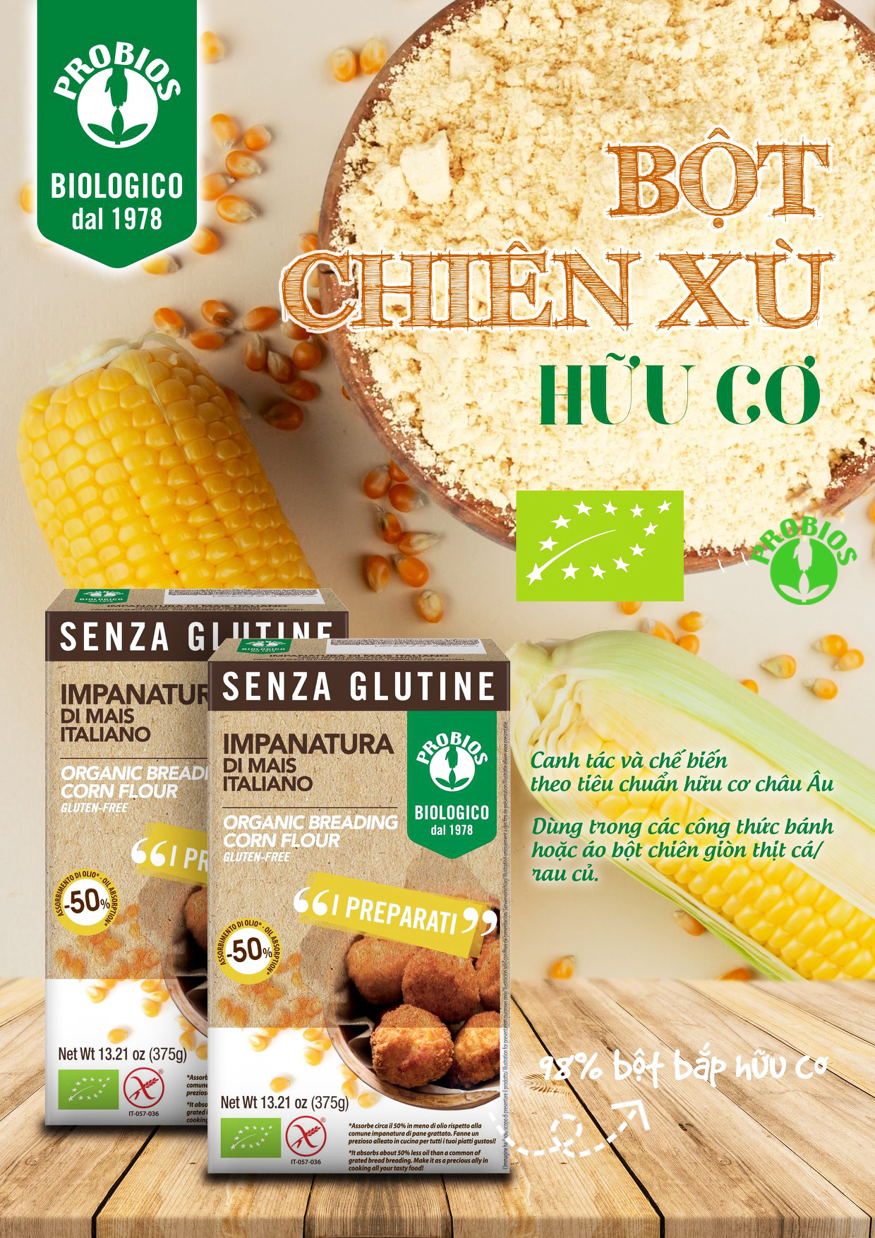 Bột ngô chiên xù hữu cơ Probios hấp thụ dầu ít hơn 50% so với bột chiên xù thông thường từ bột mì.