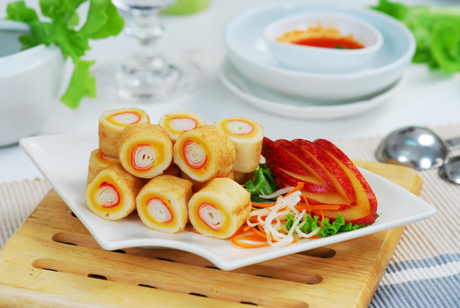 – Làm nóng chả cá cuộn thanh cua dùng trực tiếp với tương ớt