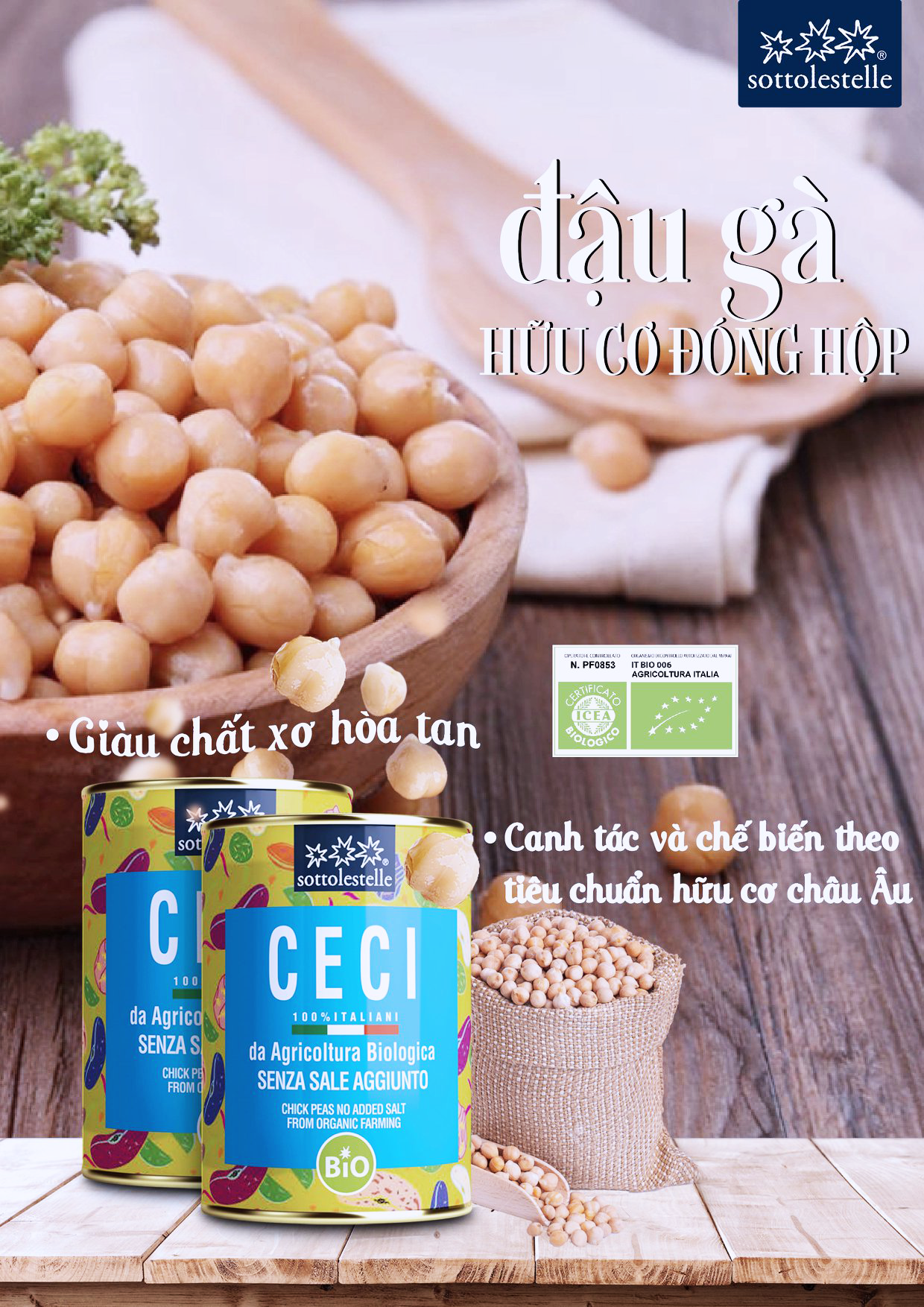 Đậu gà hữu cơ Sottolestelle không sử dụng hạt giống biến đổi Gen GMO, đạt chứng nhận Tiêu chuẩn sinh học Châu Âu và chứng nhận hữu cơ ICEA. Tất cả các nguyên liệu đều được đóng hộp trong vòng 48h sau khi thu hoạch để đảm bảo độ tươi và ngon nhất cho sản phẩm. Mang lại hương vị tươi ngon và tự nhiên nhất .
