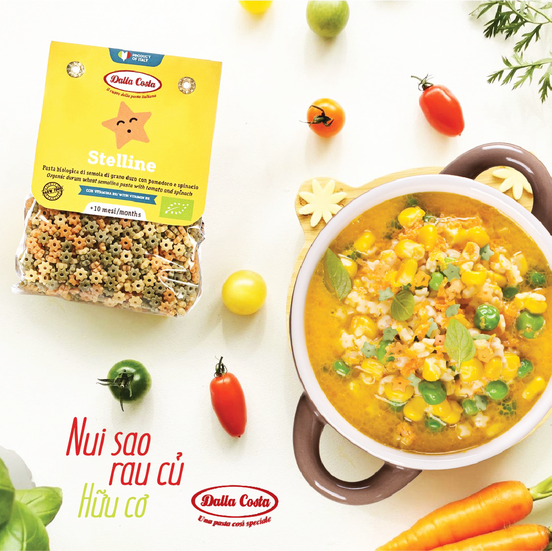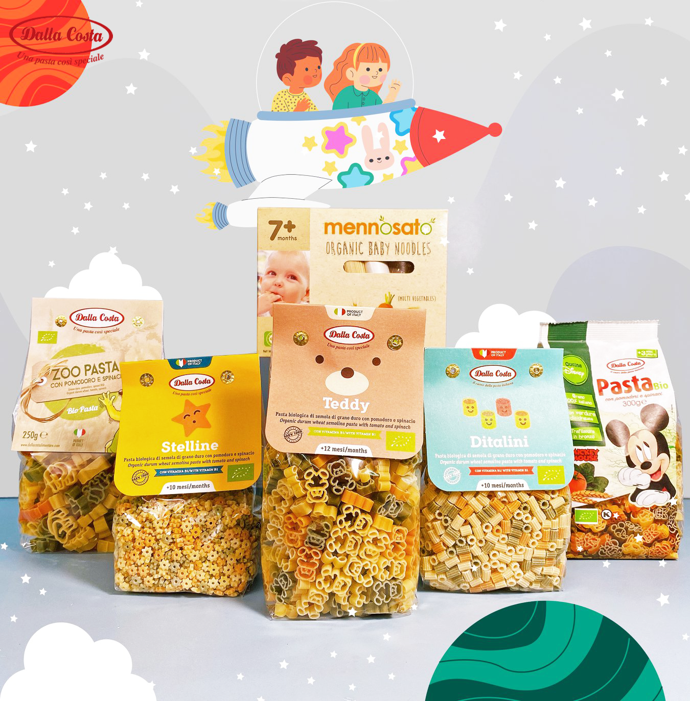 Dòng Baby Pasta thuộc thương hiệu Dalla Costa với rất nhiều hình thù ngộ nghĩnh sẽ giúp bé khám phá thế giới quanh ta qua những bữa ăn vui nhộn và cũng đầy chất dinh dưỡng từ các loại rau củ.