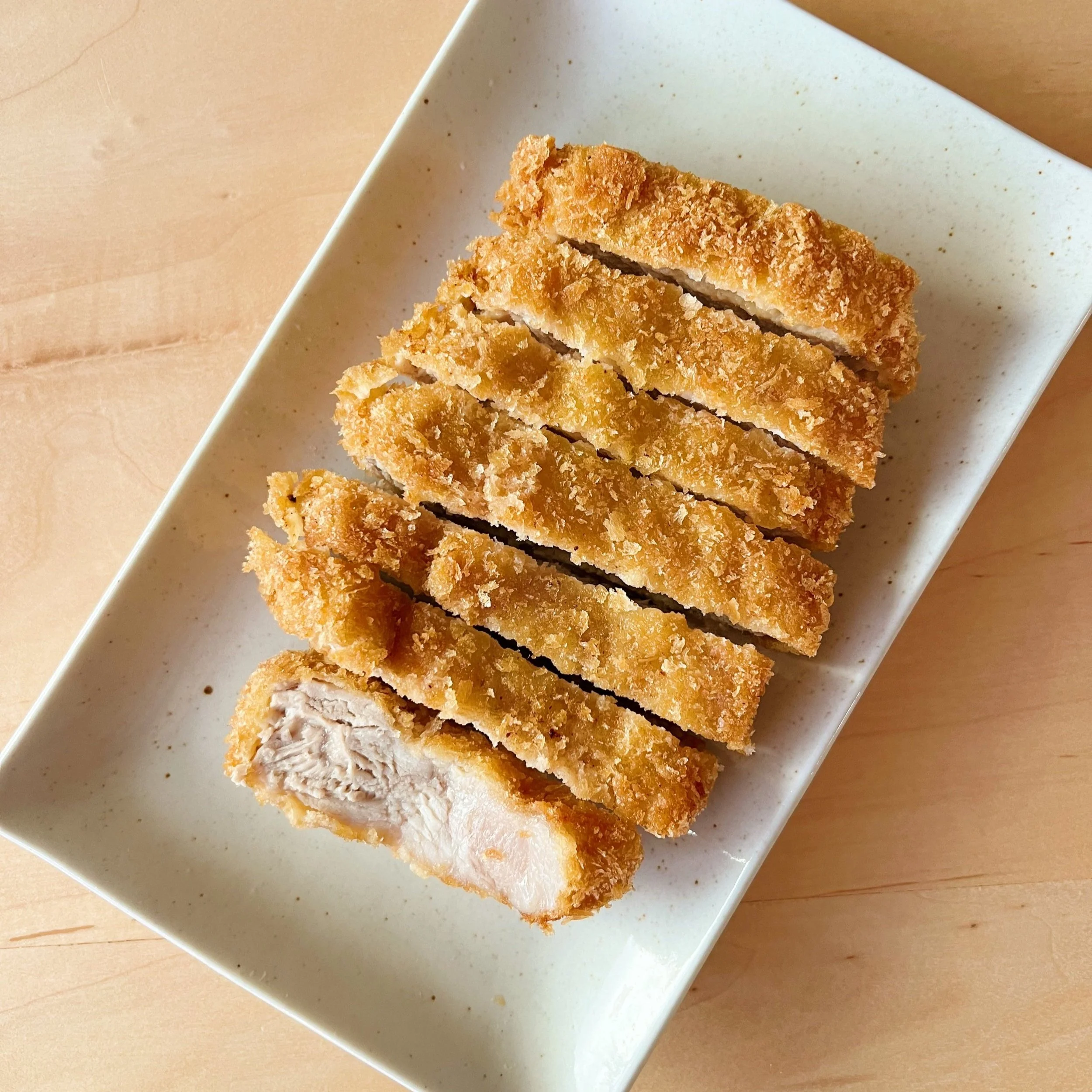 Từng miếng thịt heo được cắt lát dày vừa đủ để khi chiên lên giữ được sự cân bằng giữa độ giòn của lớp bột xù và độ mềm mọng của thớ thịt, không quá dày khiến ngán mà cũng không quá mỏng làm mất đi sự thỏa mãn khi cắn, lớp áo bột phủ ngoài sử dụng loại bột chiên xù Nhật Bản có hạt to và đều, khi chiên lên tạo nên một màu vàng óng bắt mắt, từng miếng thịt xếp ngay ngắn với lớp bột giòn bao phủ toàn bộ bề mặt, khiến món ăn trở nên hấp dẫn ngay từ ánh nhìn đầu tiên.