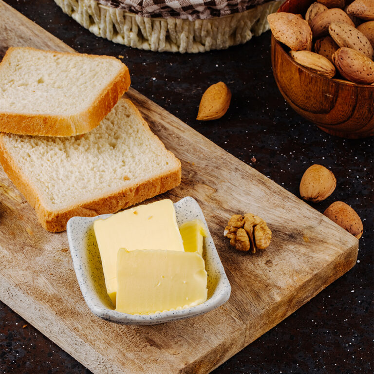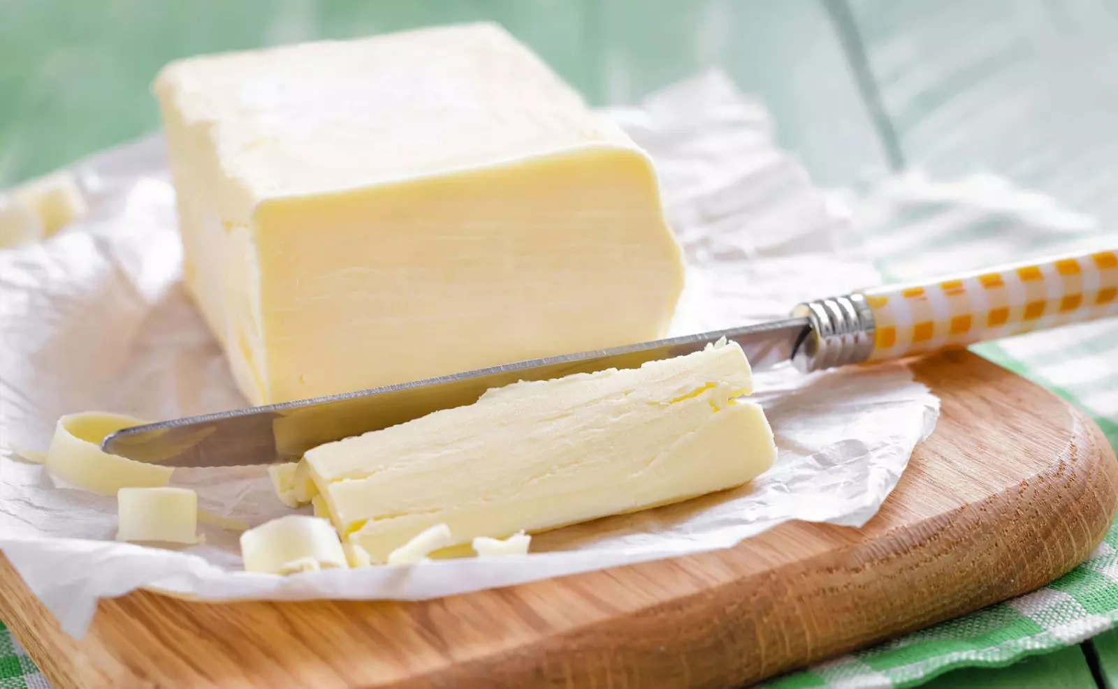 Khối bơ có màu vàng nhạt óng ả, bề mặt mịn mượt, chắc đặc mà không bị rỗ hay lỗ khí, cầm tay cảm nhận được sự dẻo dai vừa phải, dễ dàng cắt thành từng lát hay chia nhỏ theo nhu cầu. Khi để ở nhiệt độ phòng, bơ mềm ra nhanh chóng nhưng vẫn giữ nguyên cấu trúc mịn màng, giúp dễ phết lên bánh mì hoặc đánh bông cùng đường để làm cốt bánh.