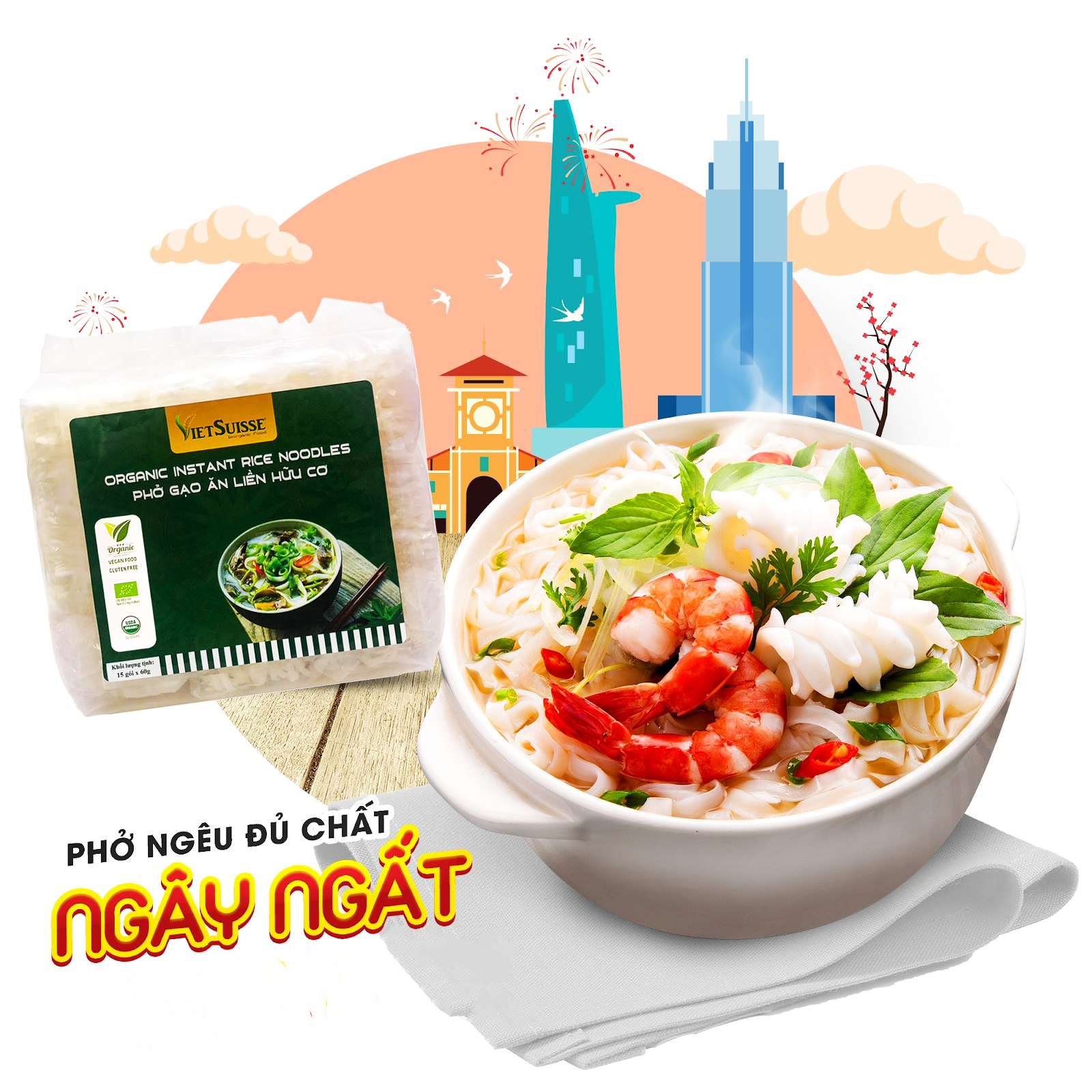 Đây là sản phẩm phở ăn liền hữu cơ đầu tiên tại Việt Nam được làm từ nhóm gạo hữu cơ ST25 xát lứt của VietSuisse có chứng nhận hữu cơ USDA, EU, JAS. Đảm bảo không chứa hóa chất, các chất bảo quản, an toàn cho sức khỏe người sử dụng.