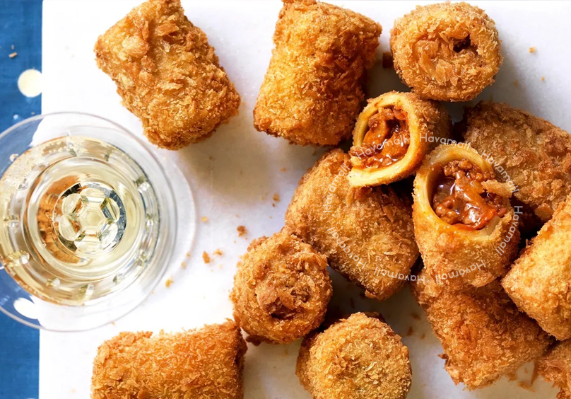 Nhồi sốt yêu thích vào từng ống mì. Lăn qua bột mì, sau đó qua trứng đánh tan và cuối cùng là qua bột chiên giòn. Đun nóng nhiều dầu đủ để ngập mì ống để vàng trong khoảng 2-3 phút. Lấy ra và để khô trên giấy bếp. Ăn ngay, nêm muối và hạt tiêu và ăn kèm với phô mai rắc nếu thích.
