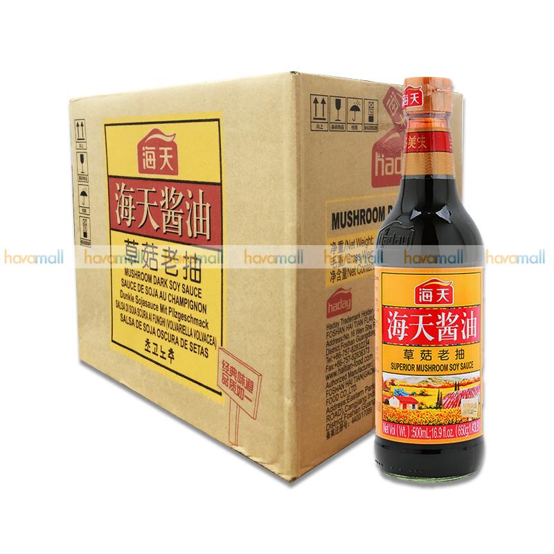 Thùng 12 Chai Hắc Xì Dầu Hương Nấm Hải Thiên 500ml – Box 12 Bottles of Mushroom Dark Soy sauce