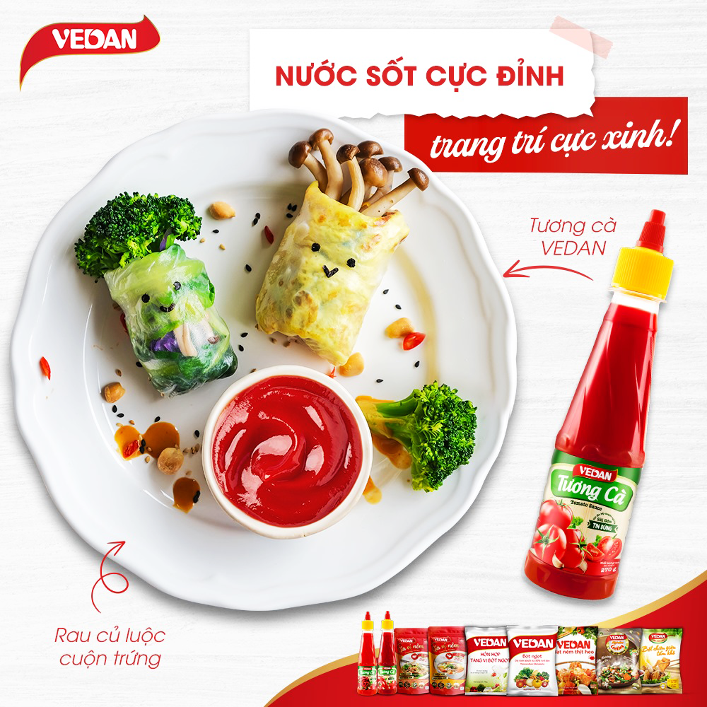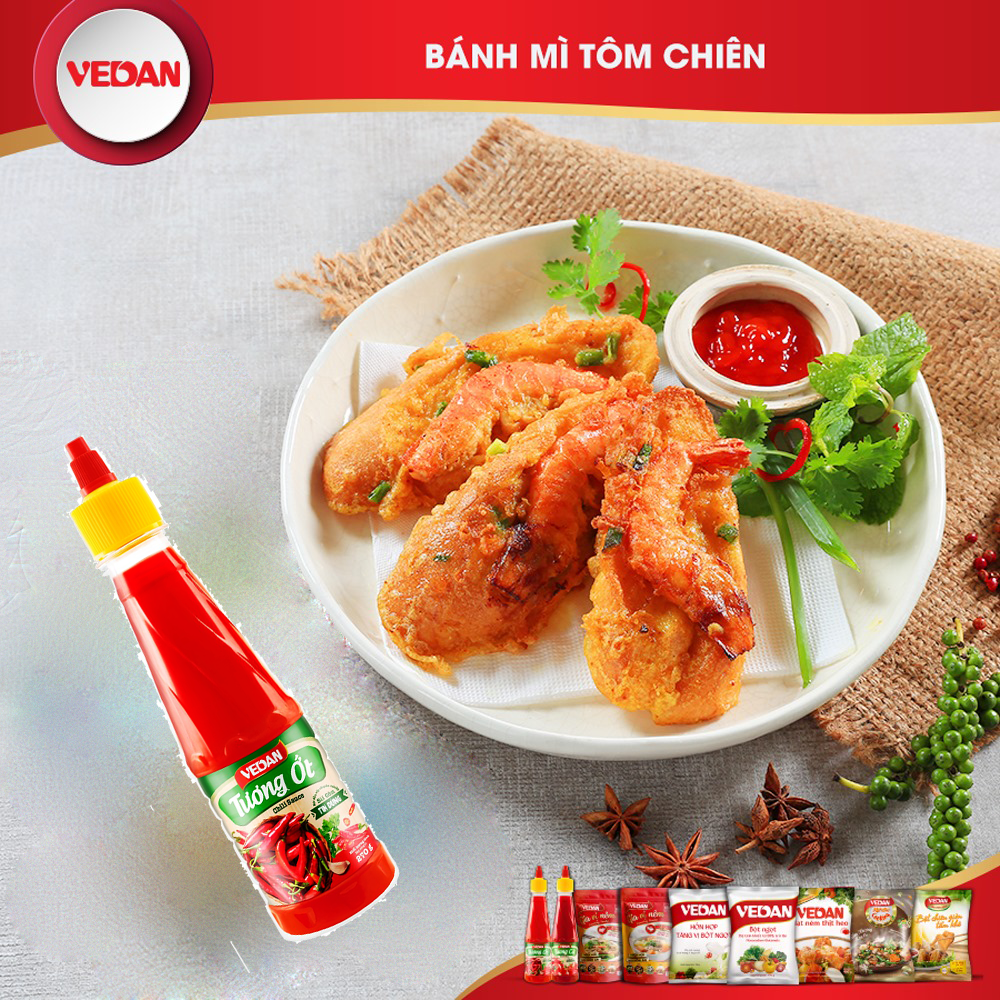 Tương ớt Vedan là một loại gia vị không thể thiếu, có mặt trong hầu hết các món ăn chiên, nướng hoặc ăn vặt. Tương ớt Vedan có màu đỏ thẫm, vị ngọt và hơi cay được làm từ ớt đỏ,nước, đường, muối,….